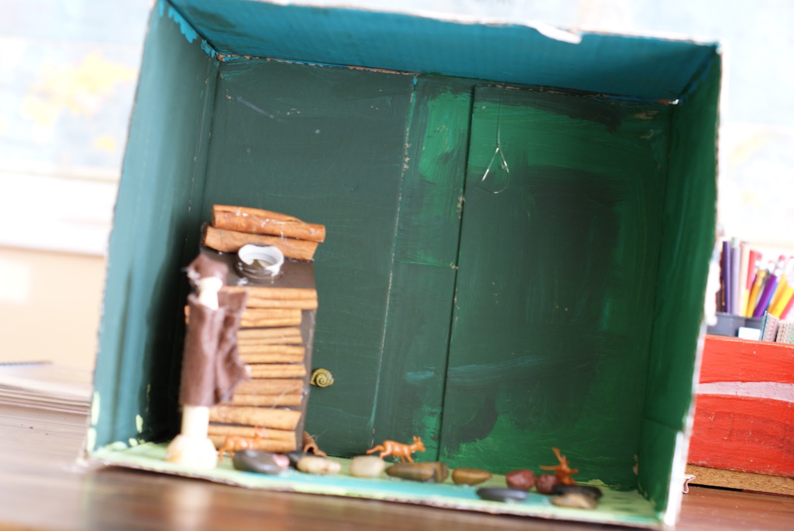 Jack made a diorama of Davy in the Tennessee forest. He added a lake too. I didn’t help these guys much. I gave them the supplies and let them go. It took a few days, but they finished and they look great. Proud mama :)