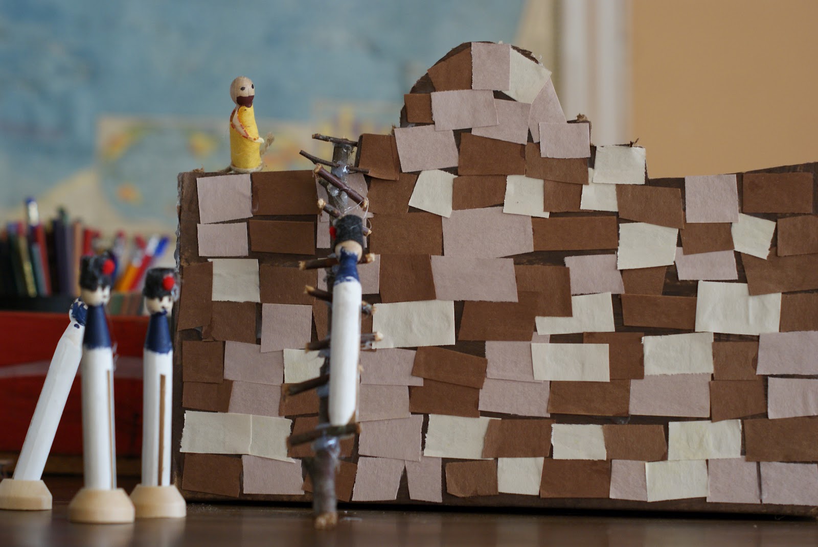 Noah is really intrigued by the story of the Alamo, so he made a little model of that. They used many, many sticks of hot glue to make these projects. I just buy those cheapo low-temp guns and they use them just fine. They work so well.
