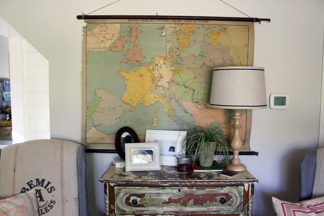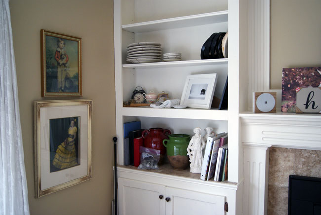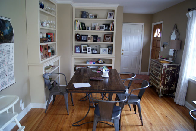Our house has a lot of built-ins, which is great, but it also creates a lot of spaces I have to arrange and keep looking tidy. My eyes can get overwhelmed really easily. The space around our table felt really squished with too many shelves, so we removed one. It feels much better now. I still need to paint the remaining one white and hang that big piece on the wall, but it’s better than before…
