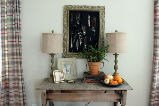 Of course, I couldn’t find any curtains I liked. So I made my own. These are definately my cooler weather curtains and I’ll change them out again in the spring. The rug isn’t new. I just took it away for the summer and brought it back. I couldn’t find anything I liked, and I don’t mind this one so it’s staying.
