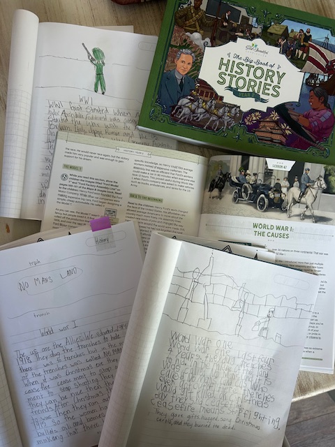 Our breakfast time encompasses quite a bit of our schoolwork. While we eat we listen to memory work, pray together and then I begin reading to the kids. Many of our catechism readings and history readings take place during breakfast, as well as a fun picture book. Often times we then will take care of notebooking after our readings.
